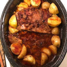I usually buy a big one, but if you are doing it maybe look for one around 3 lbs and you'll be able to freeze leftovers if you want. I cut up an onion or two, scatter the pieces in a roasting pan (spray with Pam first).Then you put the brisket on top of the onions, if the brisket has a fatty side that side should face up. Then I mix about half a packet of Lipton's Onion soup mix with about 1-2 cups of water. Stir it and then pour it over the brisket. The liquid keeps it moist while cooking and also forms part of the gravy. Season the brisket with a little salt (the soup mix has salt in it I think so you don't want to use too much), pepper, paprika, and I usually also use some ground thyme. Cover the pan and bake at 325 degrees. How long depends on how much the meat weighs so that I could tell you when you buy a brisket. You want to cook it slowly and long so the tough cut of meat gets tender. When the meat only has about 50 minutes to go, I take smallish potatoes I have already washed and cut in half and e-range them around the meat in a circle. I often use a spoon to baste them with a little of the gravy, then I put the same seasonings on them as on the meat. I often take the cover off for the last 20 minutes. Also, if the gravy level drops too low, I add a little water when needed, though it's not usually necessary.